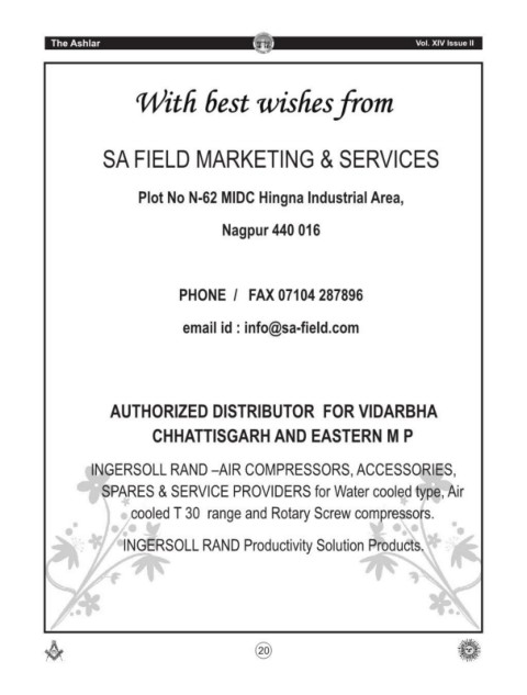 N A L G I O G E RAND LODGE The Ashlar R Vol. XIV Issue II SA FIELD MARKETING & SERVICES Plot No N-62 MIDC Hingna Industrial Area, Nagpur 440 016 PHONE / FAX 07104 287896 email id : info@sa-field.com 20