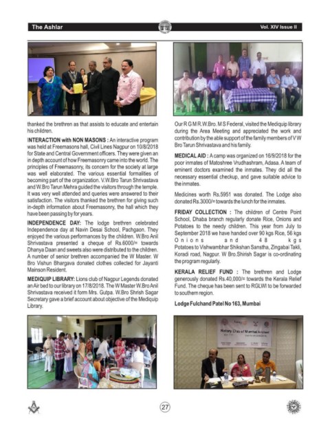 enjoyed the various performances by the children. W.Bro Anil September 2018 we have handed over 90 kgs Rice, 56 kgs
