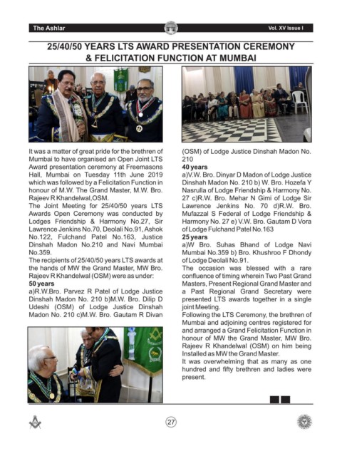Rajeev R Khandelwal,OSM.                      27 c)R.W. Bro. Mehar N Gimi of Lodge Sir
