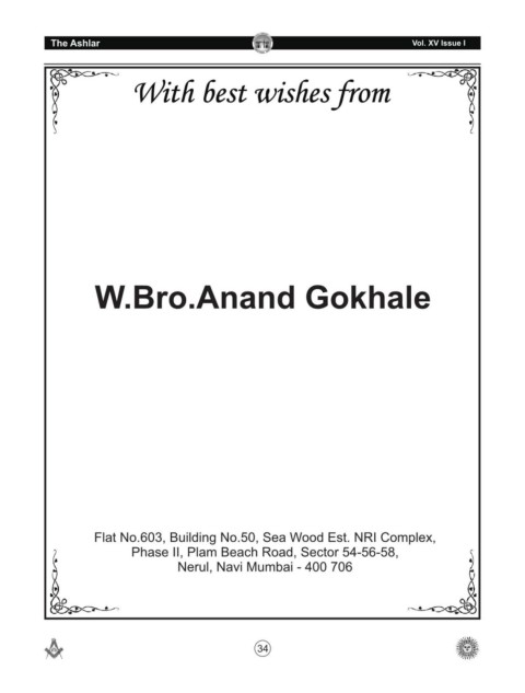 N A L G I O G E RAND LODGE The Ashlar R Vol. XV Issue I W.Bro.Anand Gokhale Flat No.603, Building No.50, Sea Wood Est. NRI Complex, Phase II, Plam Beach Road, Sector 54-56-58, Nerul, Navi Mumbai - 400 706 34