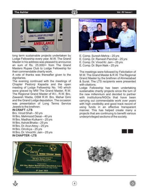 Lodge Fellowship every year. M.W. The Grand E. Comp. Dr. Ramesh Panchal – 25 yrs