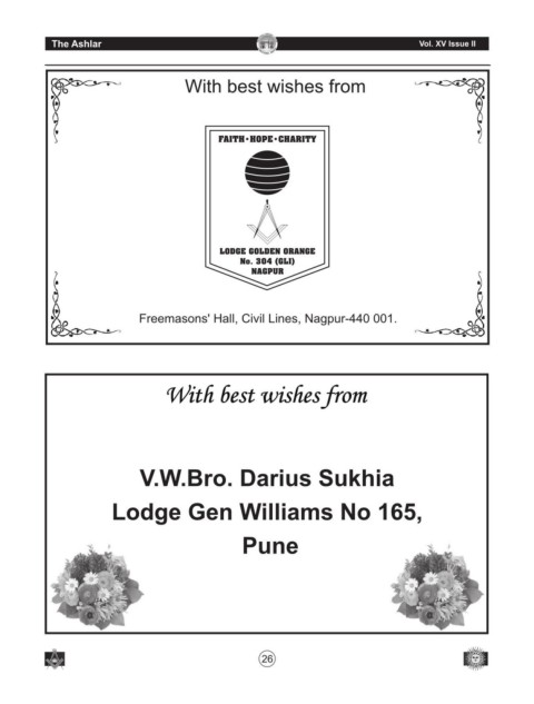 N A L G R I O G E AND LODGE The Ashlar R Vol. XV Issue II V.W.Bro. Darius Sukhia Lodge Gen Williams No 165, Pune 26