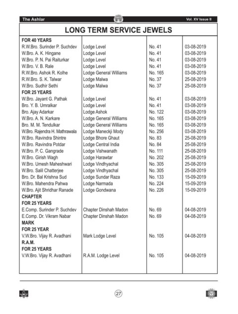 Bro. Ajay Adarkar          Lodge Ashok                  No. 122         03-08-2019
