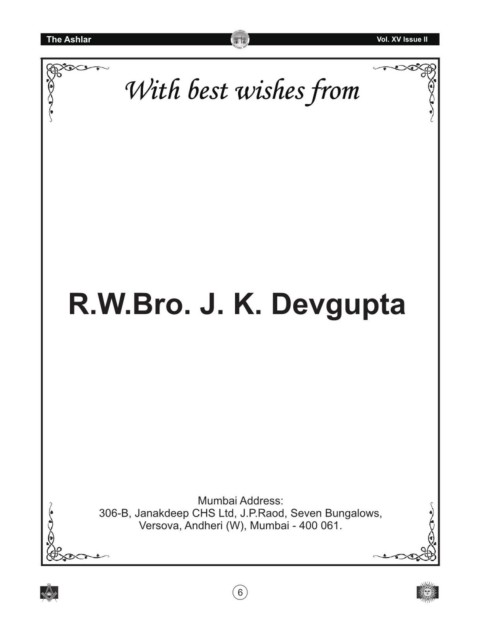 N A L G R I O G E AND LODGE The Ashlar R Vol. XV Issue II R.W.Bro. J. K. Devgupta Mumbai Address: 306-B, Janakdeep CHS Ltd, J.P.Raod, Seven Bungalows, Versova, Andheri (W), Mumbai - 400 061. 6