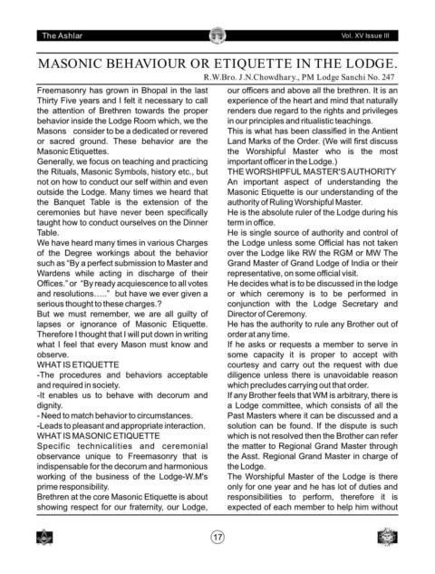 outside the Lodge. Many times we heard that Masonic Etiquette is our understanding of the