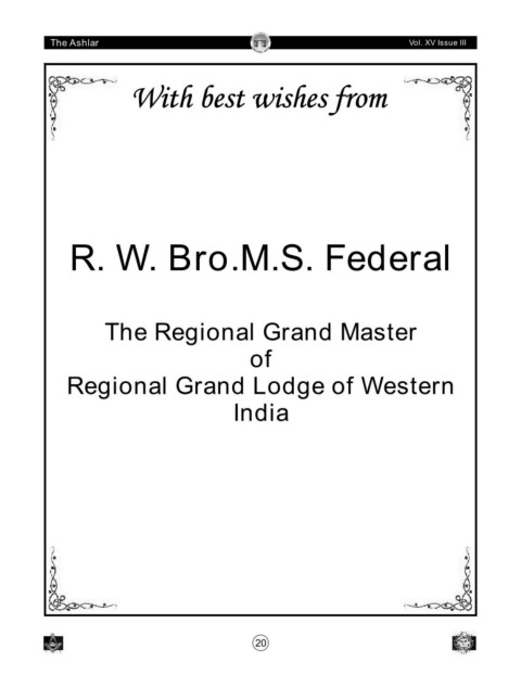 N A L G R I O G E AND LODGE The Ashlar R Vol. XV Issue III R. W. Bro.M.S. Federal The Regional Grand Master of Regional Grand Lodge of Western India 20