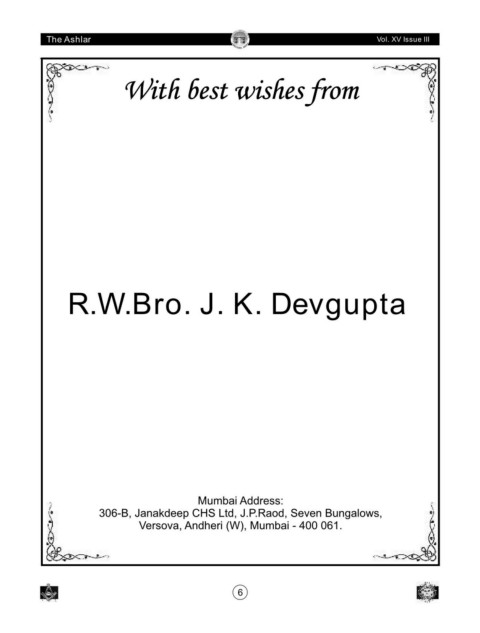 N A L G R I O G E AND LODGE The Ashlar R Vol. XV Issue III R.W.Bro. J. K. Devgupta Mumbai Address: 306-B, Janakdeep CHS Ltd, J.P.Raod, Seven Bungalows, Versova, Andheri (W), Mumbai - 400 061. 6