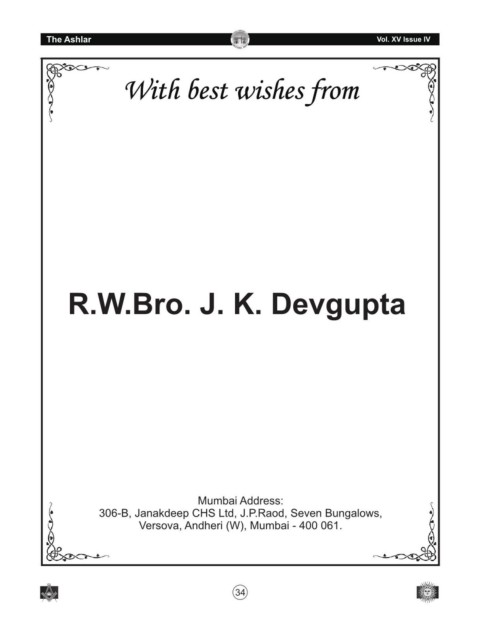 N A L G R I O G E AND LODGE The Ashlar R Vol. XV Issue IV R.W.Bro. J. K. Devgupta Mumbai Address: 306-B, Janakdeep CHS Ltd, J.P.Raod, Seven Bungalows, Versova, Andheri (W), Mumbai - 400 061. 34