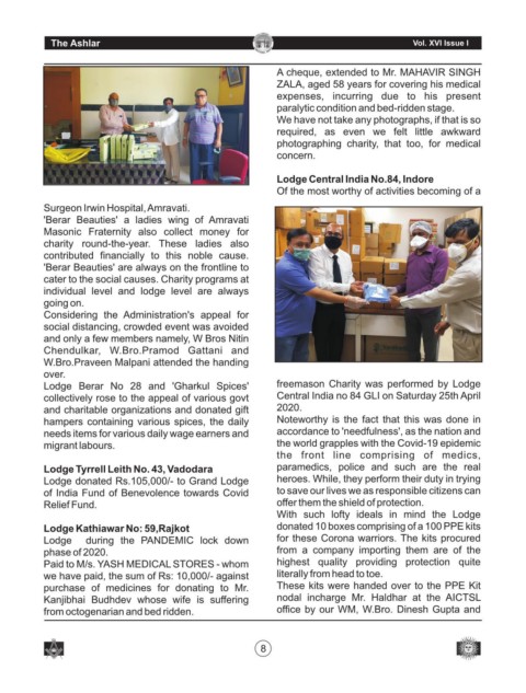 Lodge Kathiawar No: 59,Rajkot donated 10 boxes comprising of a 100 PPE kits