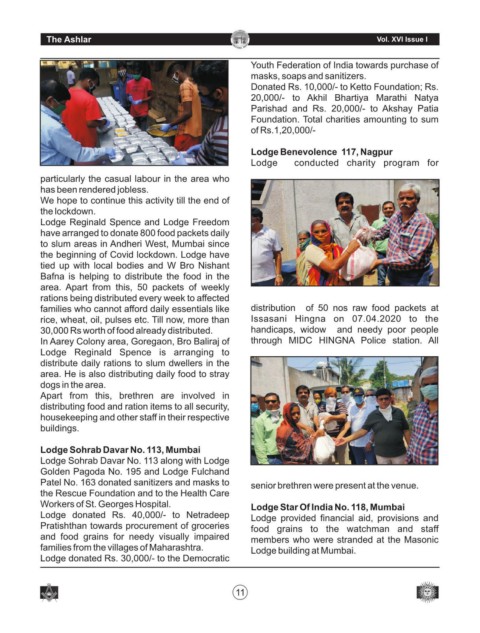 and food grains for needy visually impaired members who were stranded at the Masonic