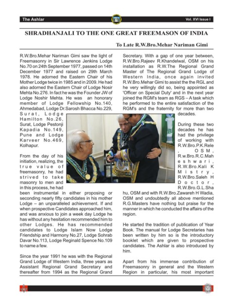 Mother Lodge twice in 1985 and in 2009. He had R.W.Bro.Mehar Gimi to assist the the RGL and