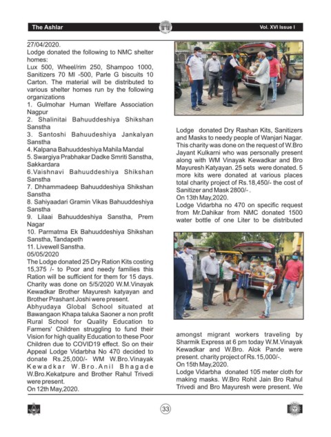 Sanstha                                        Lodge   donated Dry Rashan Kits, Sanitizers