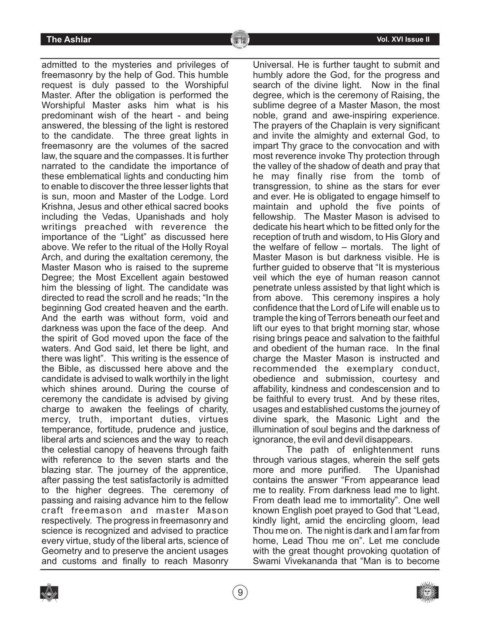 including the Vedas, Upanishads and holy fellowship. The Master Mason is advised to