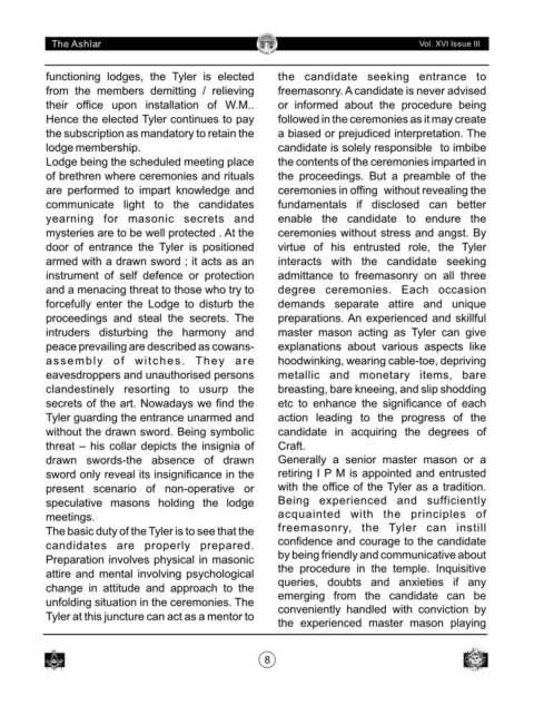 functioning lodges, the Tyler is elected the candidate seeking entrance to