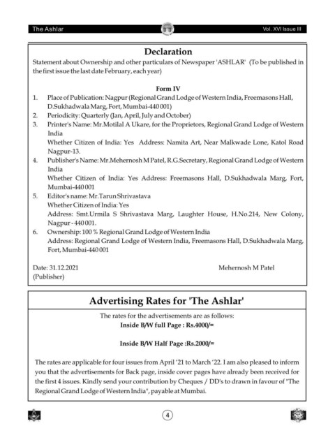 4. Publisher's Name: Mr.Mehernosh M Patel, R.G.Secretary, Regional Grand Lodge of Western