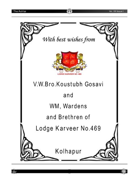 N A L G R I O G E AND LODGE Bulletin-I The Ashlar Covid-19 R Vol. XX Issue I V.W.Bro.Koustubh Gosavi and WM, Wardens and Brethren of Lodge Karveer No.469 Kolhapur 12