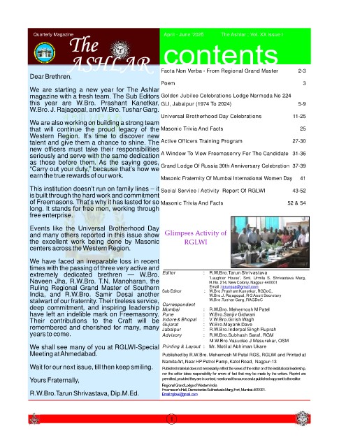 Ruling Regional Grand Master of Southern Sub Editor : W.Bro.Prashant Kanetkar, RGDoC,
