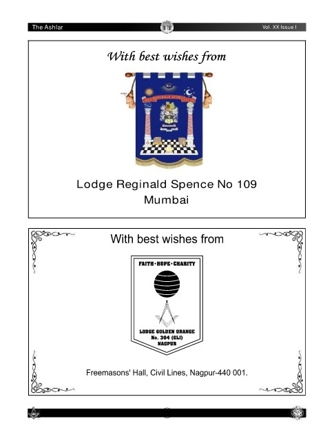 N A L G R I O G E AND LODGE The Ashlar R Vol. XX Issue I Lodge Reginald Spence No 109 Mumbai 32