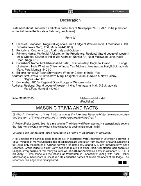 1. Place of Publication: Nagpur (Regional Grand Lodge of Western India, Freemasons Hall,