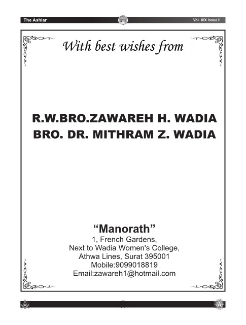 N A L G R I O G E AND LODGE The Ashlar R Vol. XIX Issue II R.W.BRO.ZAWAREH H. WADIA BRO. DR. MITHRAM Z. WADIA “Manorath” 1, French Gardens, Next to Wadia Women's College, Athwa Lines, Surat 395001 Mobile:9099018819 Email:zawareh1@hotmail.com 28